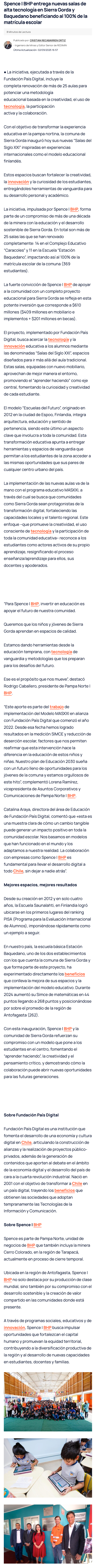 Spence | BHP entrega nuevas salas de alta tecnología en Sierra Gorda y Baquedano beneficiando al 100% de la matrícula escolar - (nuevaminería online)