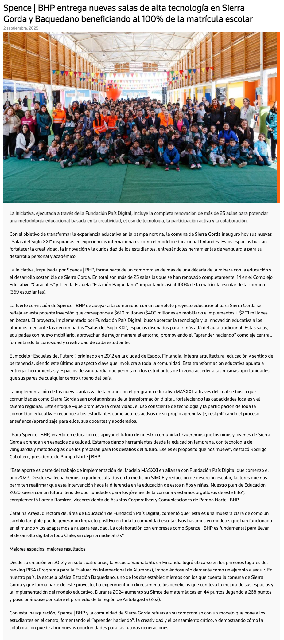 Inversión de $610 millones beneficia a más de 360 estudiantes de la comuna: Spence | BHP entrega nuevas salas de alta tecnología en Sierra Gorda y Baquedano beneficiando al 100% de la matrícula escolar - (regionesnoticias.cl)