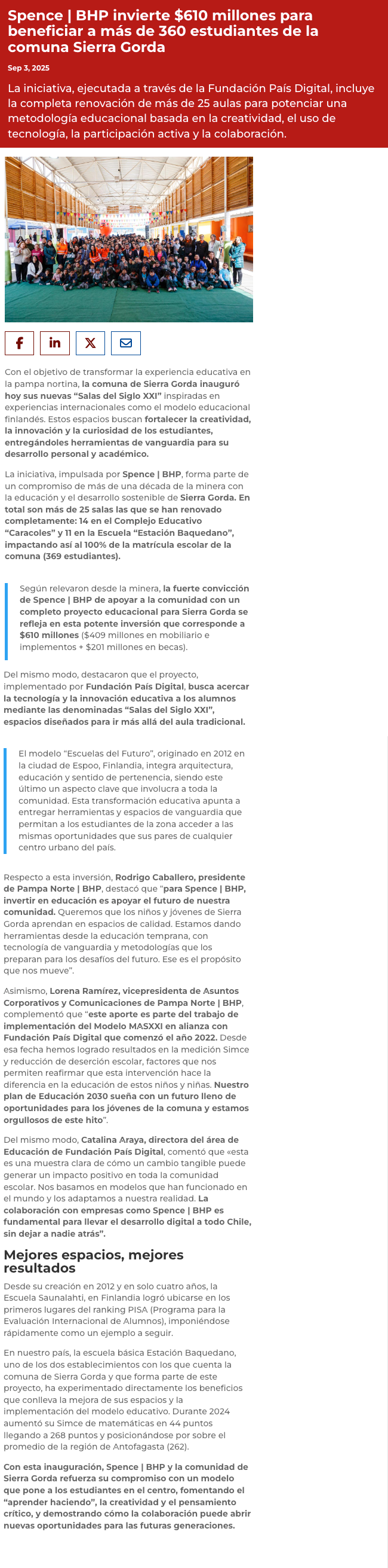 Spence | BHP entrega nuevas salas de alta tecnología en Sierra Gorda y Baquedano beneficiando al 100% de la matrícula escolar - (timeline)