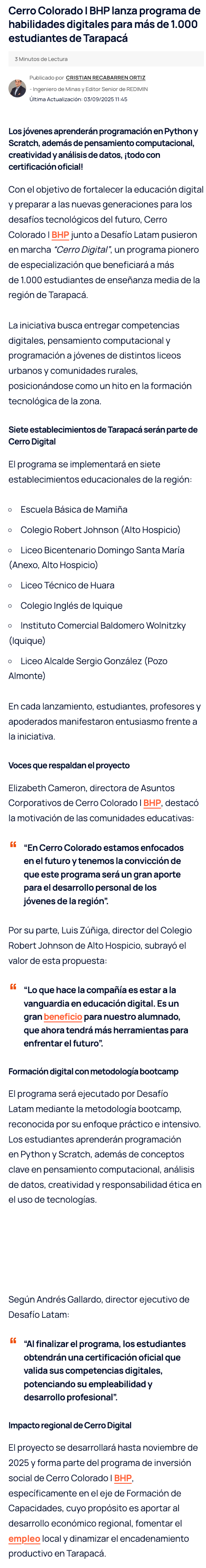 Cerro Colorado | BHP lanza programa de habilidades digitales para más de 1.000 estudiantes de Tarapacá - (portaleduca.cl)