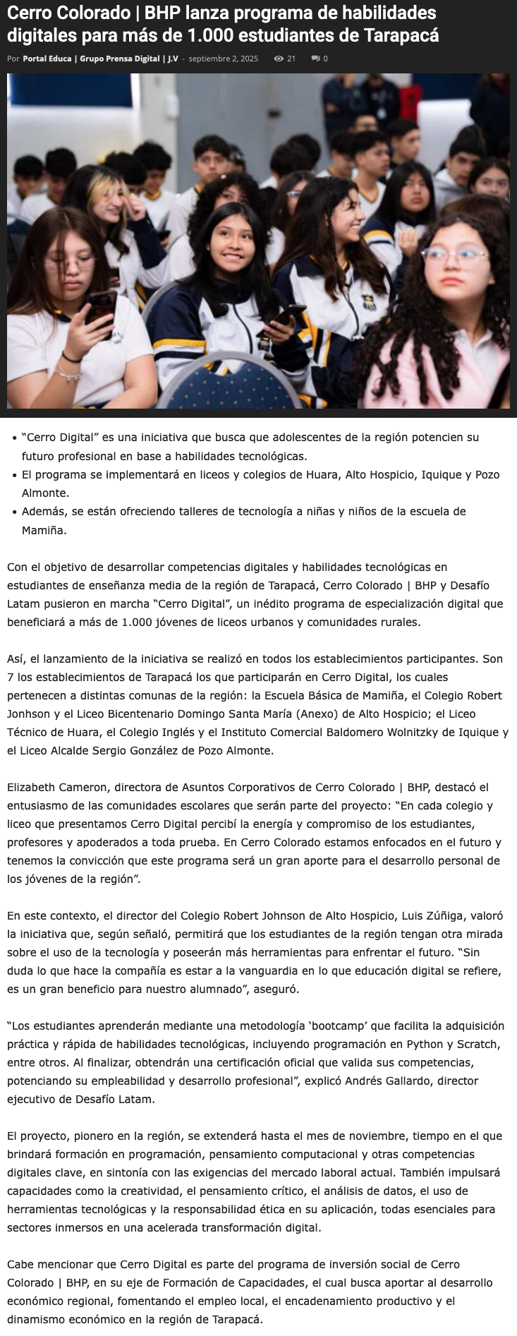 Cerro Colorado | BHP lanza programa de habilidades digitales para más de 1.000 estudiantes de Tarapacá - (redimin)