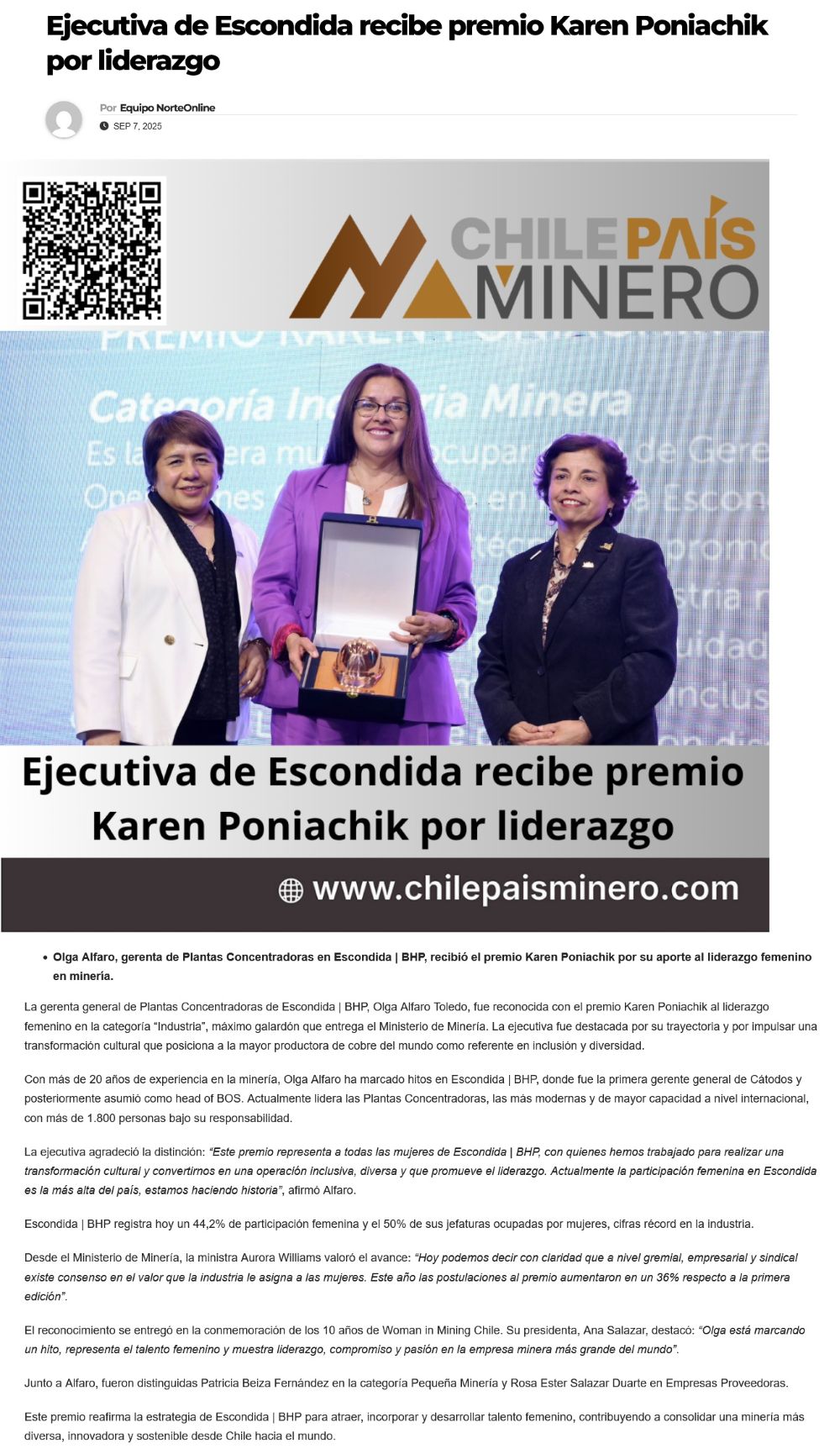 Ejecutiva de Escondida | BHP recibe premio Karen Poniachik al liderazgo femenino en la minería - (mineriayfuturo.cl)