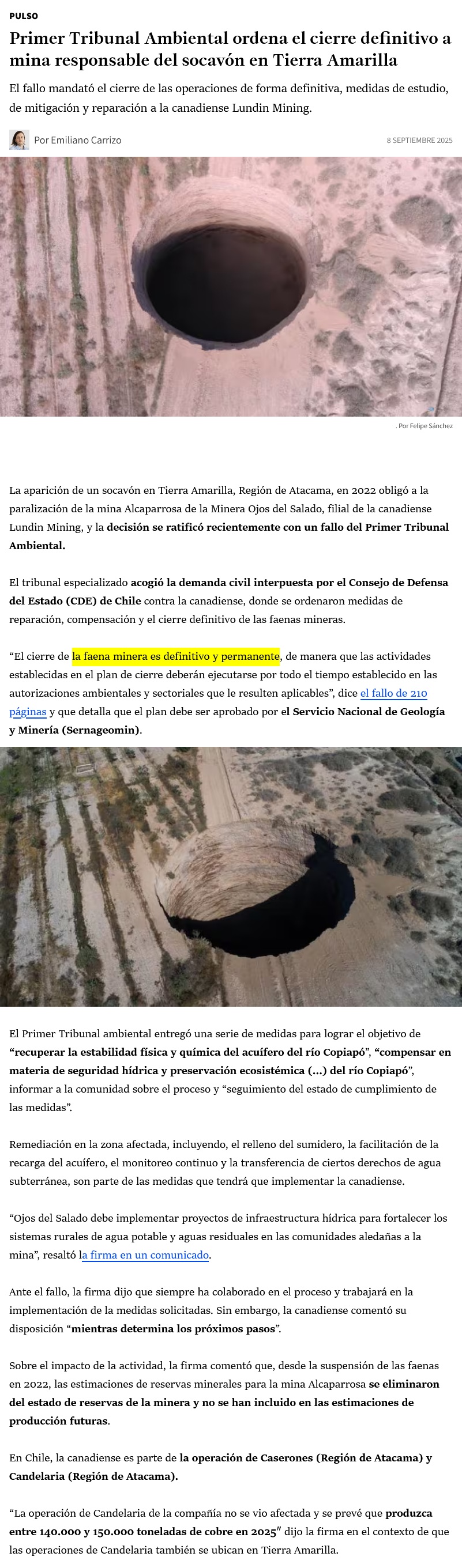 Ordenan el cierre definitivo a mina responsable del socavón en Tierra Amarilla - (Pulso)