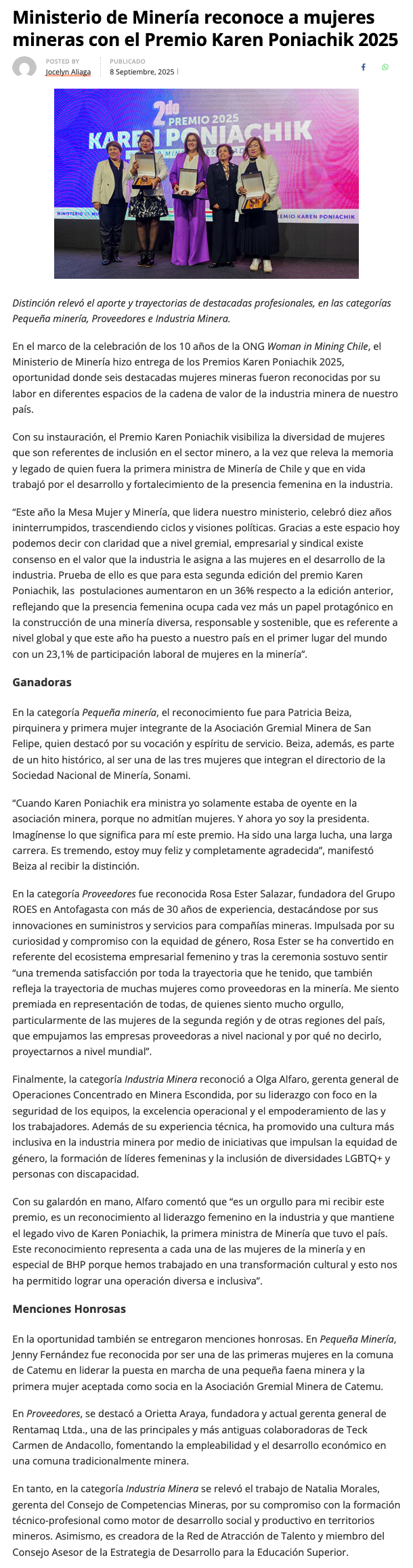Ministerio de Minería reconoce a mujeres mineras con el Premio Karen Poniachik 2025 - (portalminero)
