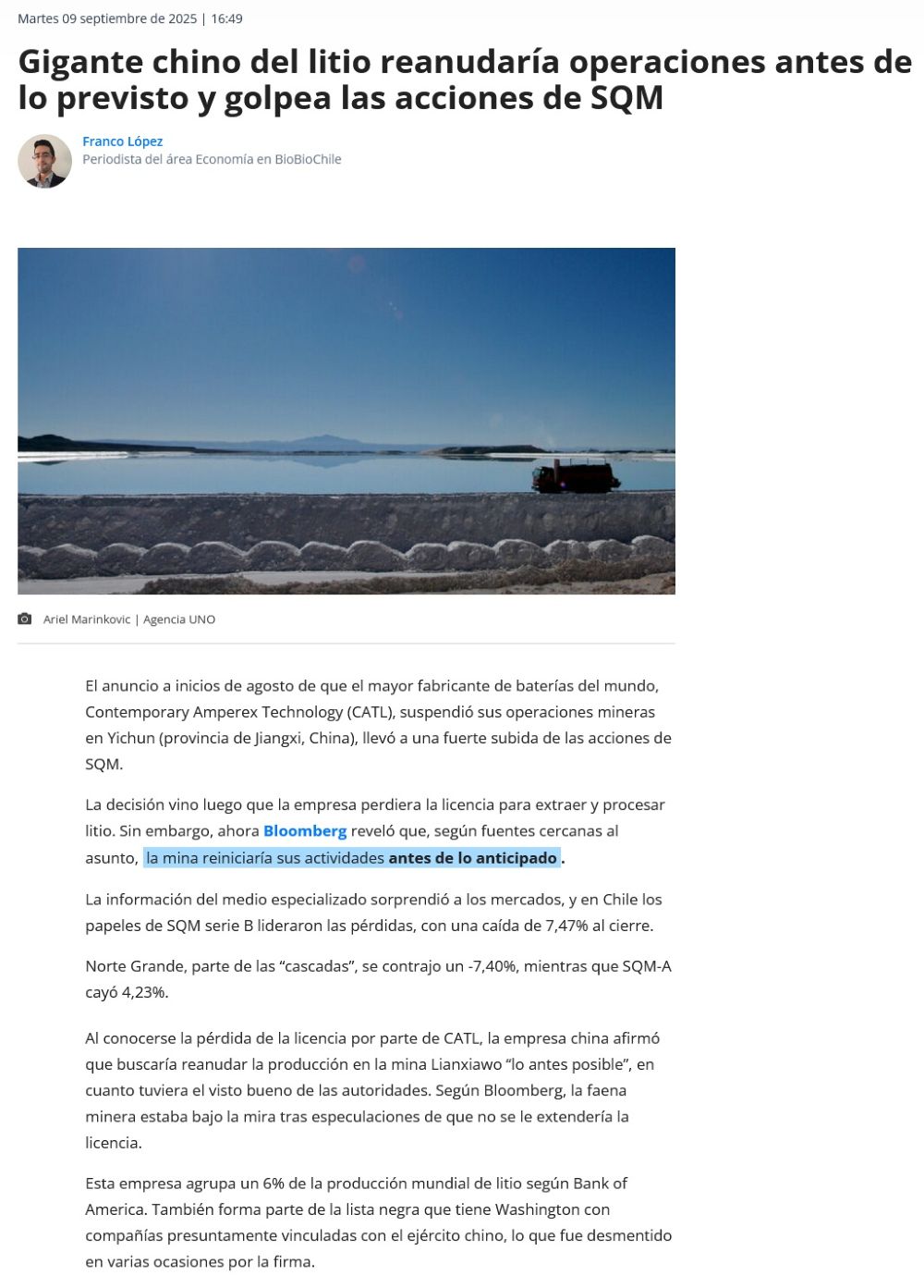 Acciones de SQM y otros gigantes de litio caen tras reportes sobre reactivación de mina en China - (La Tercera Online)