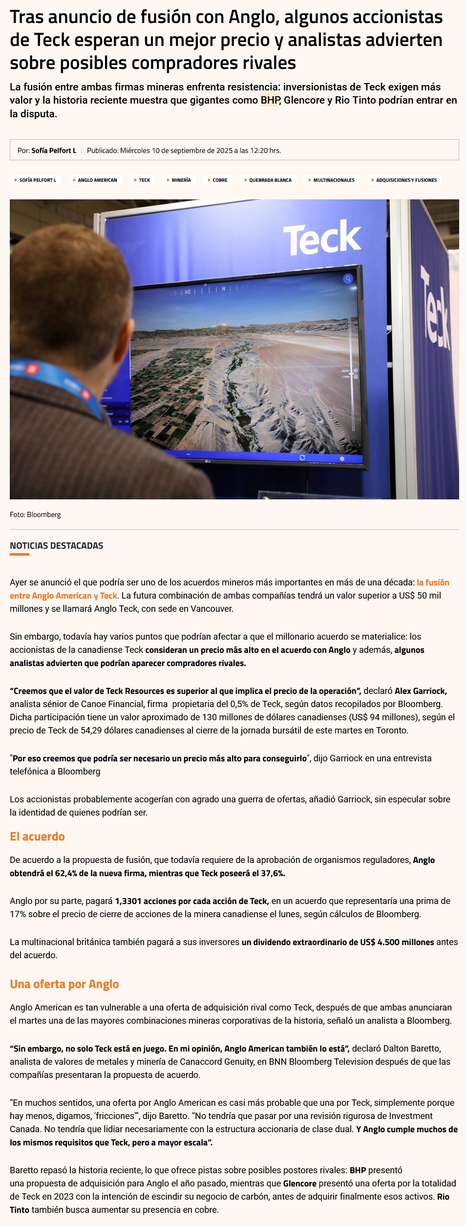 Accionistas minoritarios y mejores ofertas rivales: las vallas más desafiantes para Anglo Teck - (Diario Financiero)