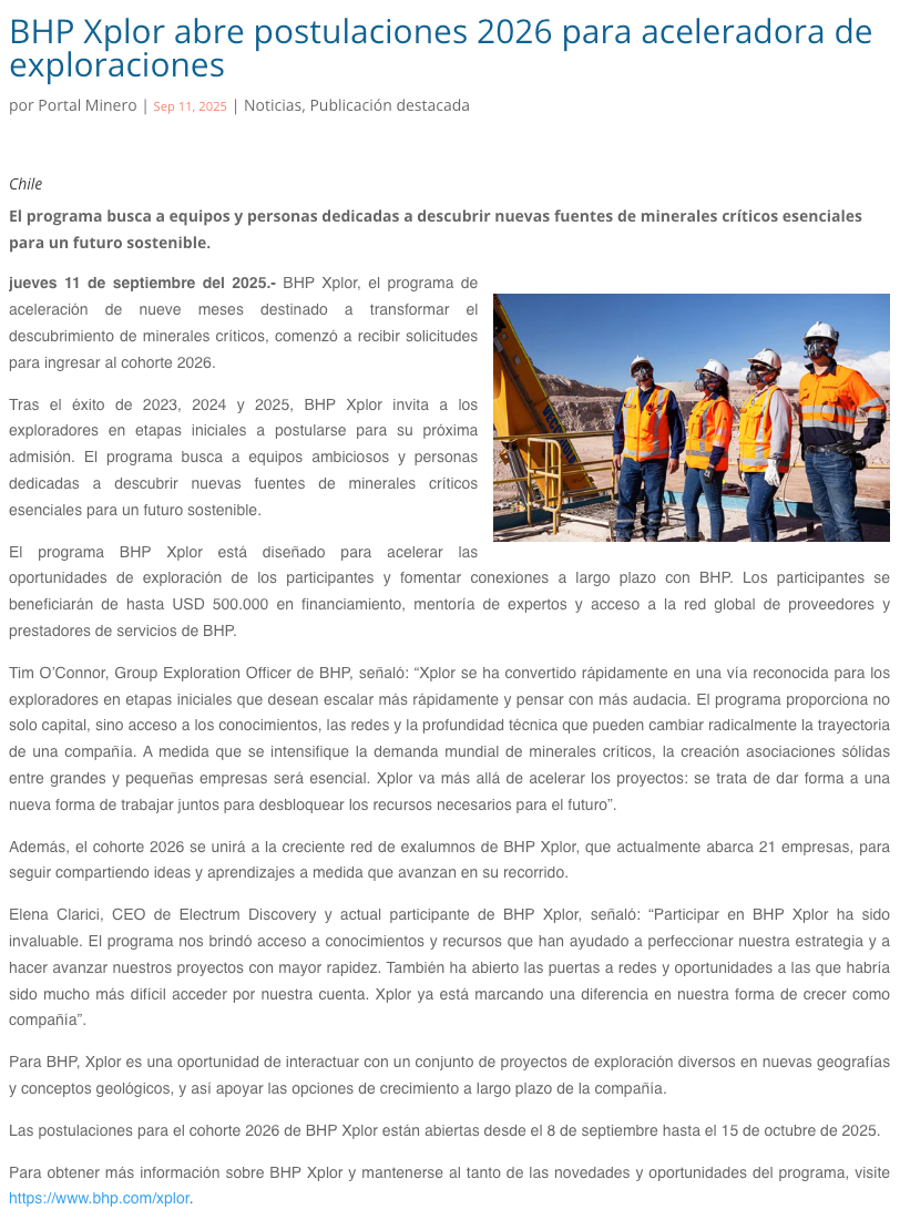 BHP abre postulaciones 2026 de su aceleradora de exploraciones Xplor - (electromineria.cl)