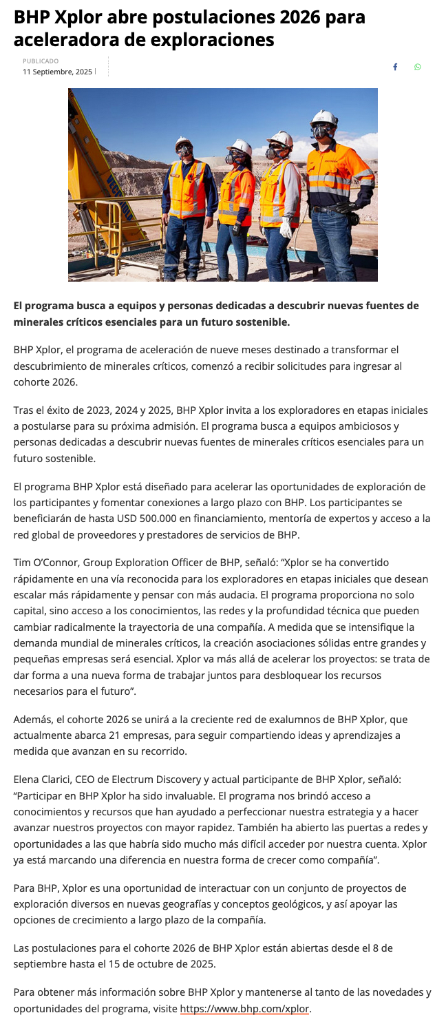 BHP abre postulaciones 2026 de su aceleradora de exploraciones Xplor - (electromineria.cl)
