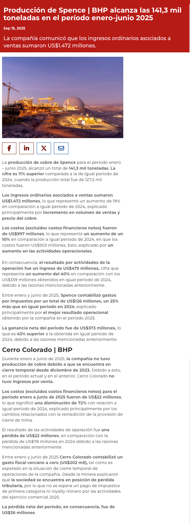 Producción de Spence | BHP alcanza 141,3 mil toneladas - (portalminero)