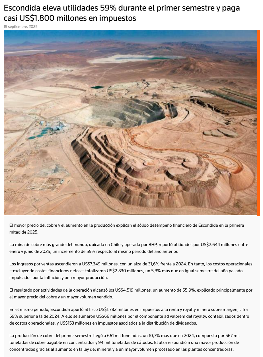 Escondida eleva utilidades un 59% en el primer semestre y aporta casi US$1.800 millones en impuestos - (redimin)