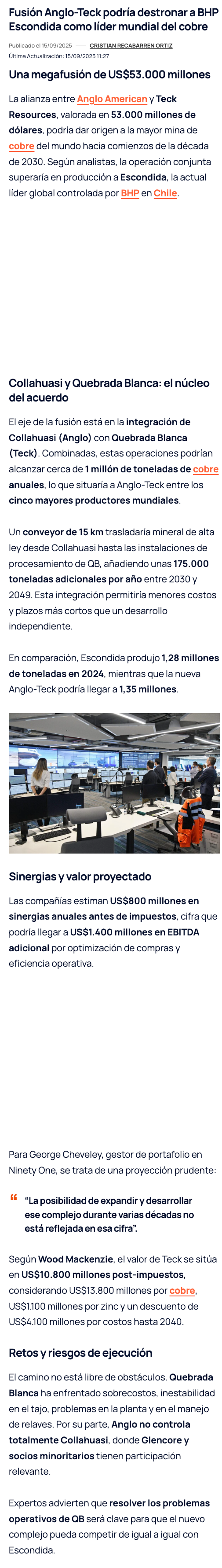Fusión Anglo-Teck podría destronar a Escondida como mayor productora de cobre - (mineriayfuturo.cl)