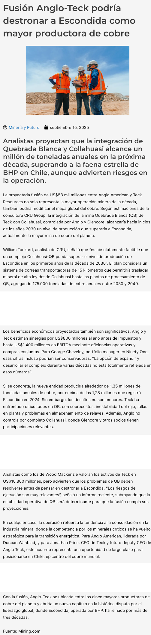 Fusión Anglo-Teck podría destronar a BHP Escondida como líder mundial del cobre - (redimin)