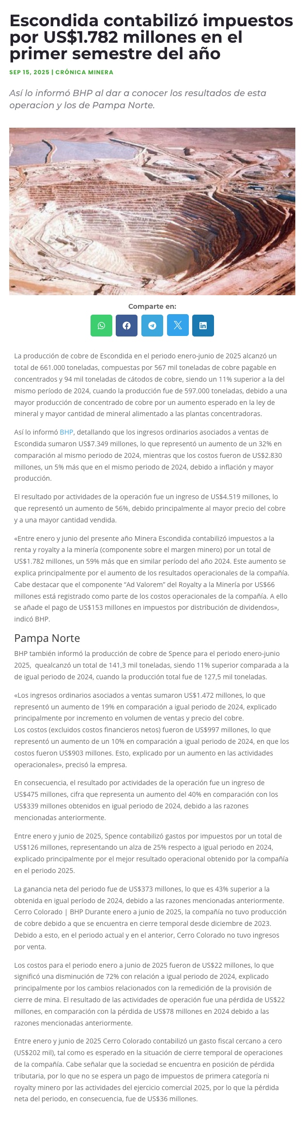 Ganancias de Escondida crecen 59% en el primer semestre y aportes fiscales superan los US$1.700 millones - (soyantofagasta)