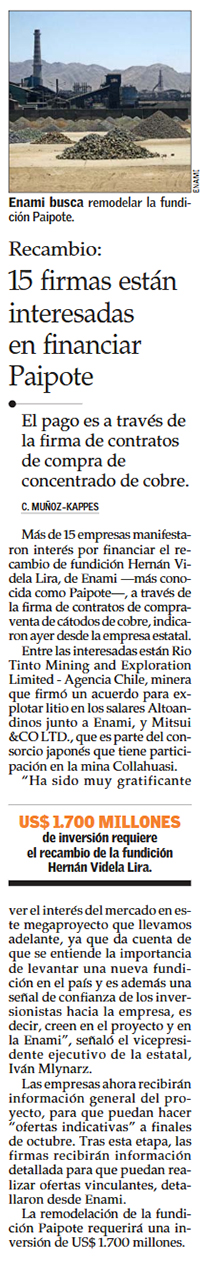 Fondos, bancos, mineras y traders interesados en desarrollar fundición de Enami por US$ 1.700 millones - (Diario Financiero)
