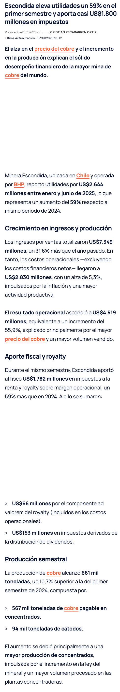 Escondida contabiliza impuestos por US$1.782 millones en los primeros seis meses del año - (mch.cl)