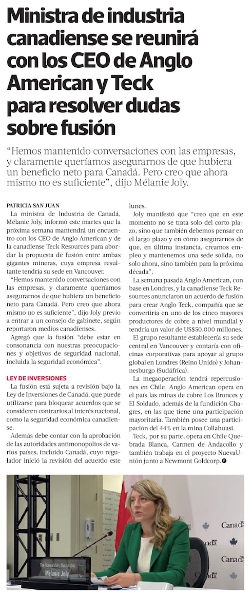 Canadá plantea reparos a fusión de Anglo American y Teck y dice que las compañías aún deben demostrar las ventajas del acuerdo - (DF Online)