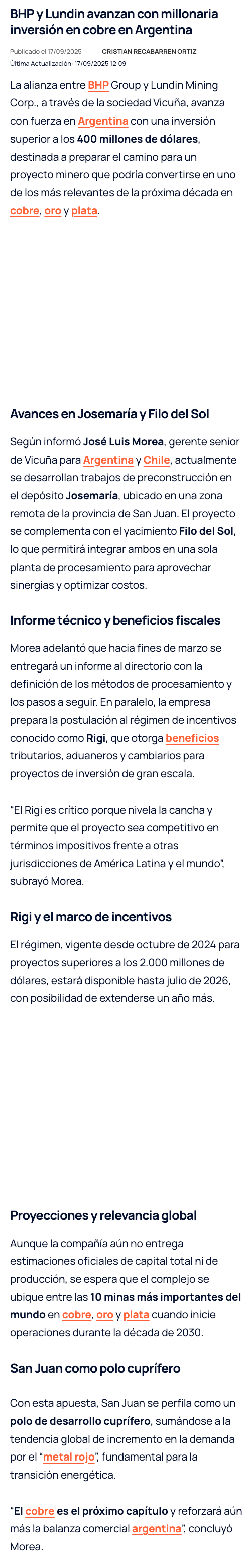 BHP y Lundin Mining invertirán US$ 400 millones en polo cuprífero de San Juan, Argentina - (reporteminero)