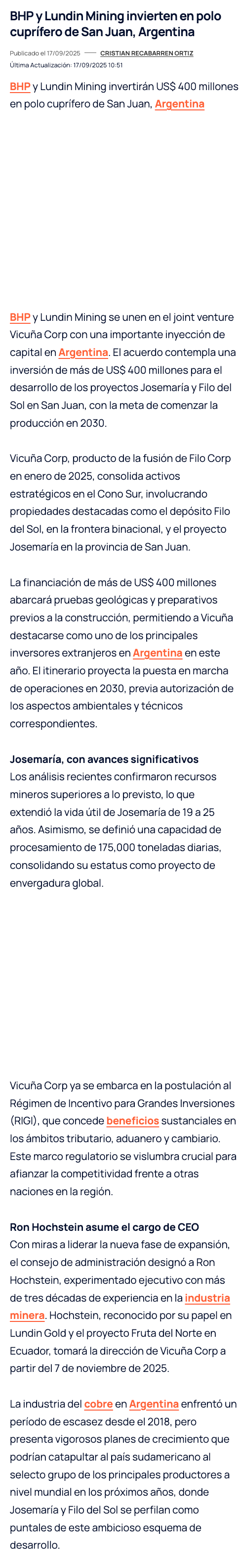 BHP y Lundin Mining invertirán US$ 400 millones en polo cuprífero de San Juan, Argentina - (reporteminero)