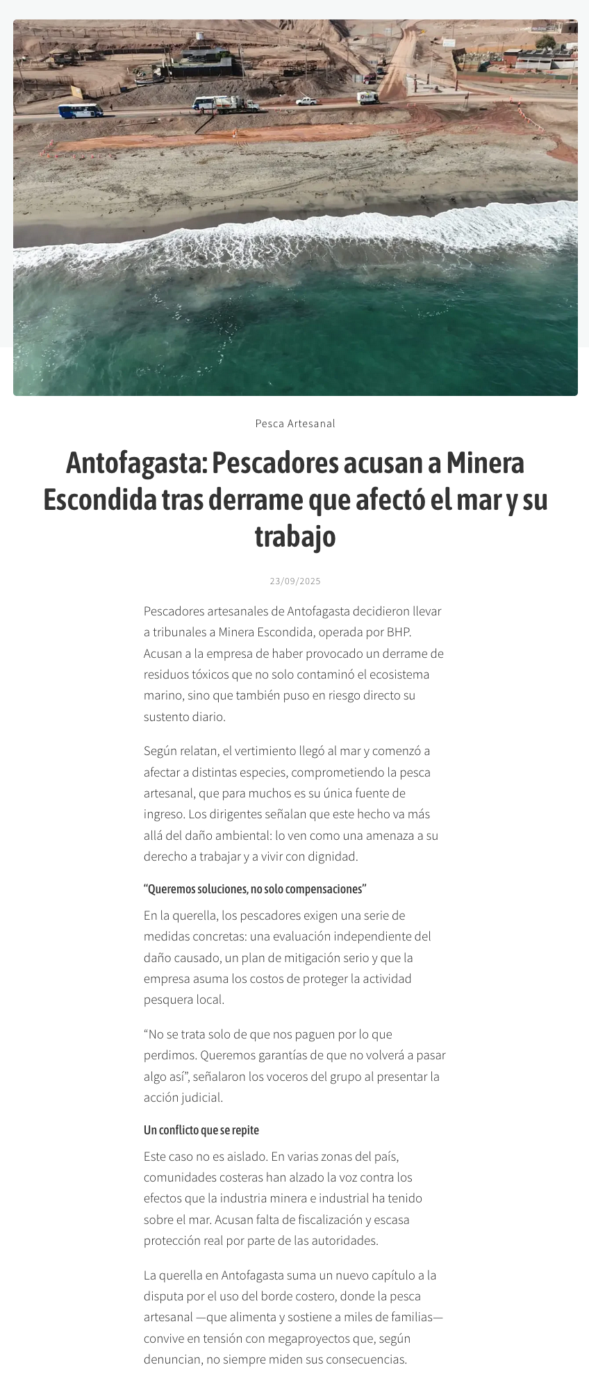 Pescadores artesanales de Antofagasta demandan a Minera Escondida tras derrame que afectó el borde costero - (elregionalista)
