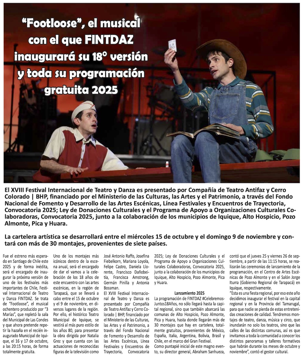 “Footloose”, el musical con el que FINTDAZ inaugurará su 18° versión y toda su programación gratuita 2025 - (El Longino de Alto Hospicio)