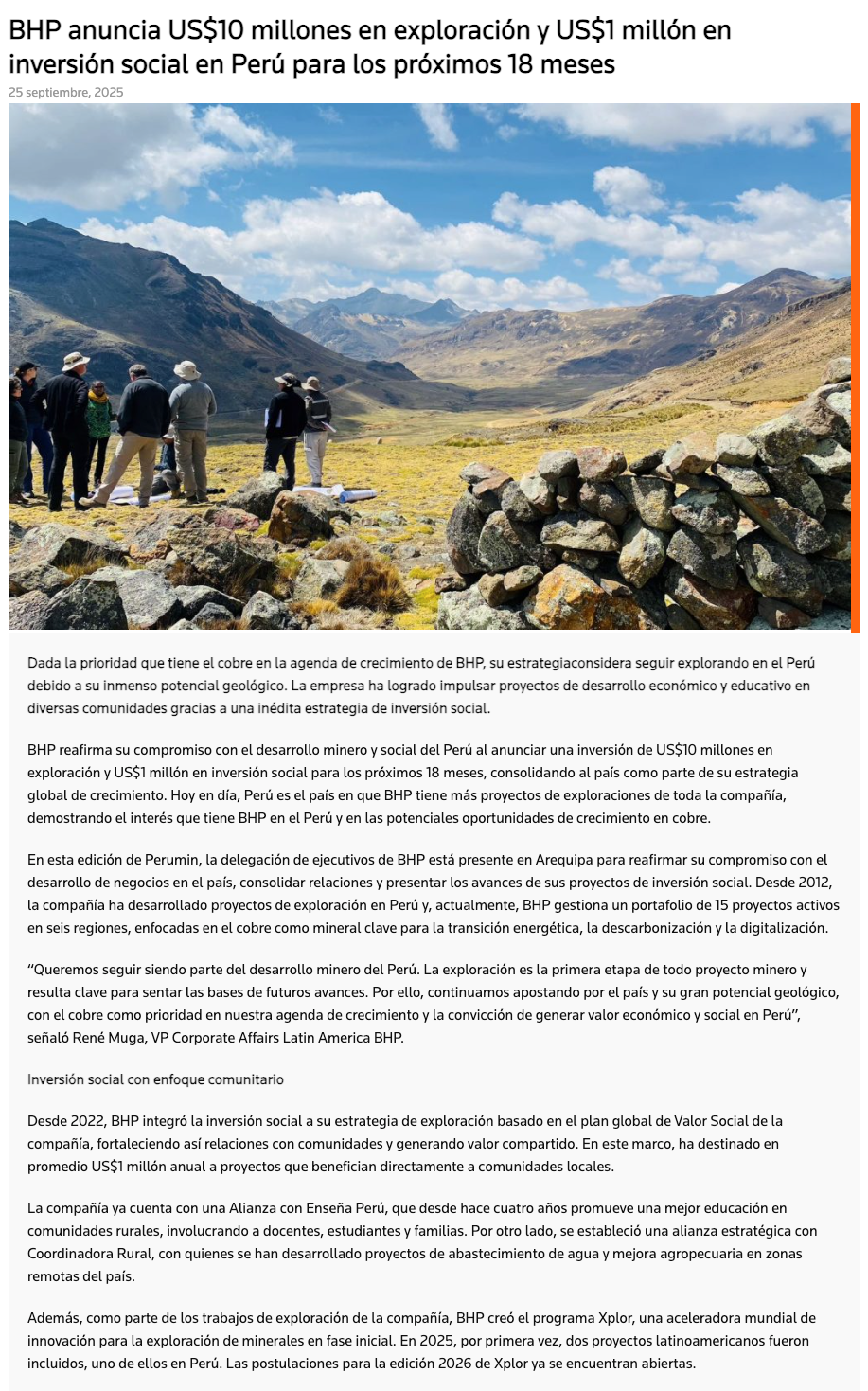 BHP anuncia US$10 millones en exploración y US$1 millón en inversión social en Perú para los próximos 18 meses - (portalminero)
