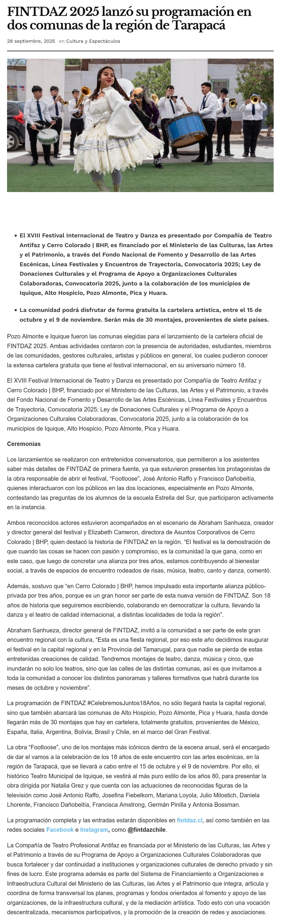 FINTDAZ 2025 lanzó programación en Tarapacá. Comunidad podrá disfrutar cartelera artística, entre el 15 de octubre y el 9 de noviembre - (edicioncero)