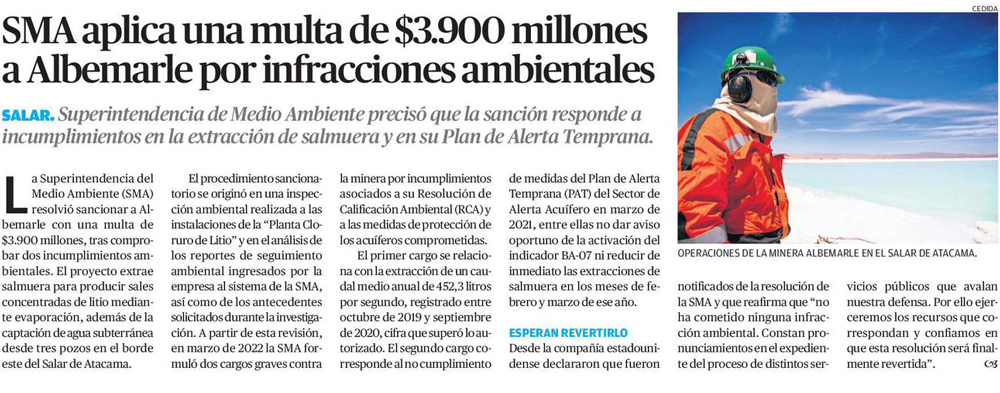 SMA multa a Albermarle con $3,9 mil millones - (El Mercurio de Santiago)