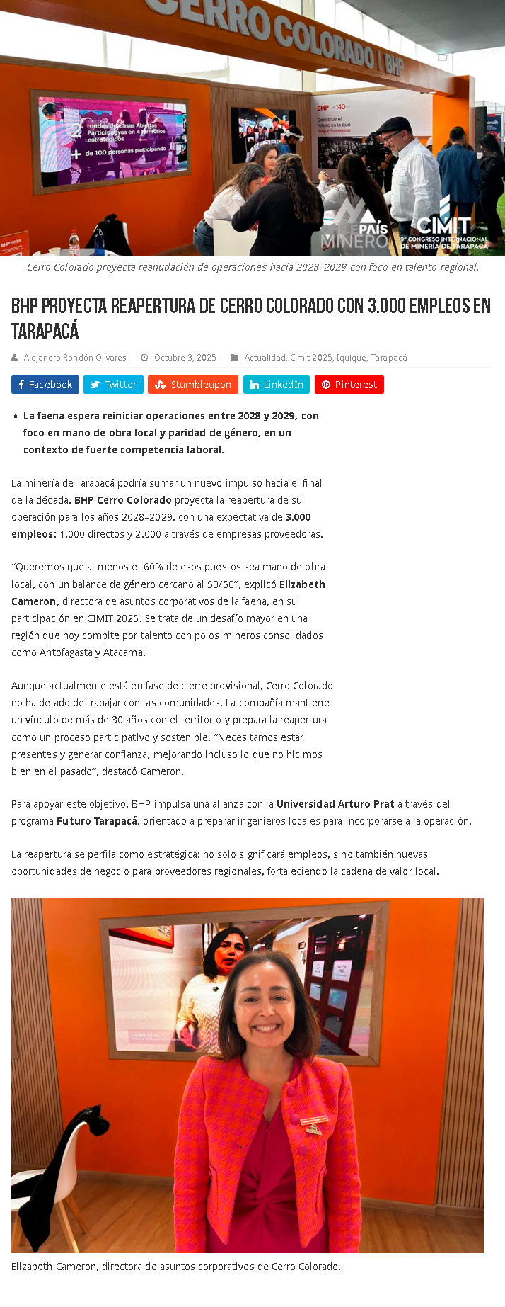 BHP proyecta reapertura de Cerro Colorado con 3.000 empleos en Tarapacá - (norteonline.cl)