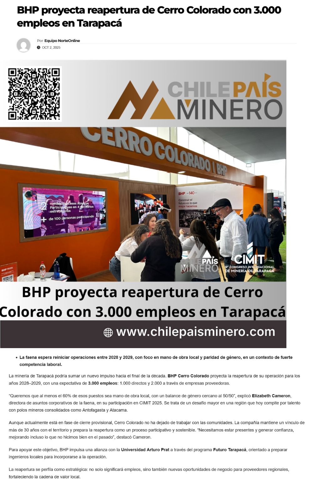 BHP proyecta reapertura de Cerro Colorado con 3.000 empleos en Tarapacá - (chilepaisminero.com)