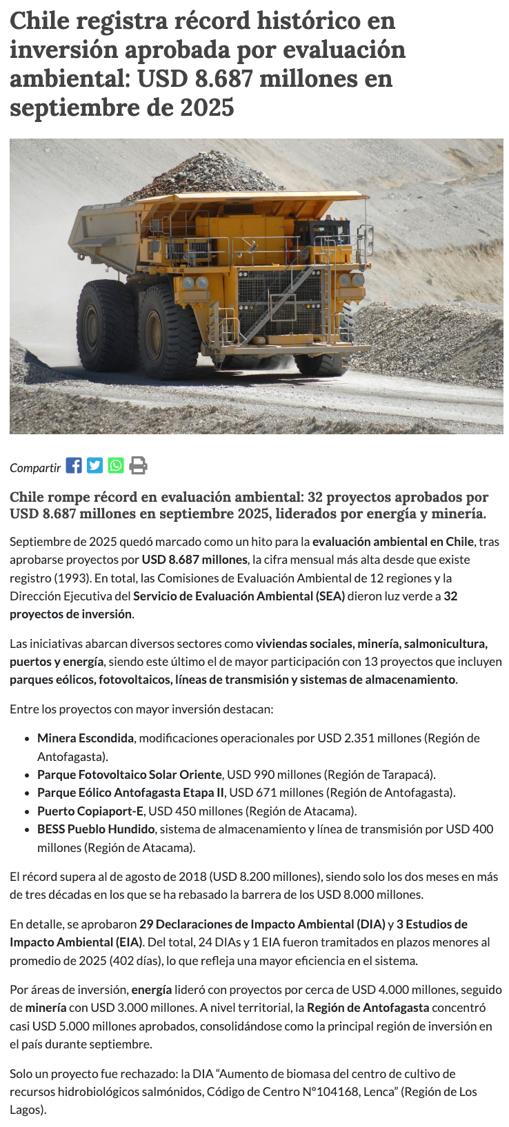 Chile alcanza récord histórico en aprobación ambiental: 32 proyectos por US$ 8.687 millones en septiembre - (reporteminero)