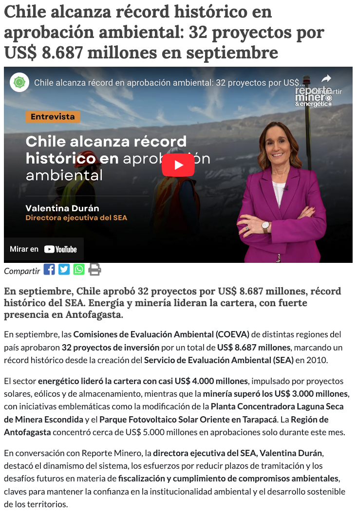 Chile registra récord histórico en inversión aprobada por evaluación ambiental: USD 8.687 millones en septiembre de 2025 - (reporteminero)