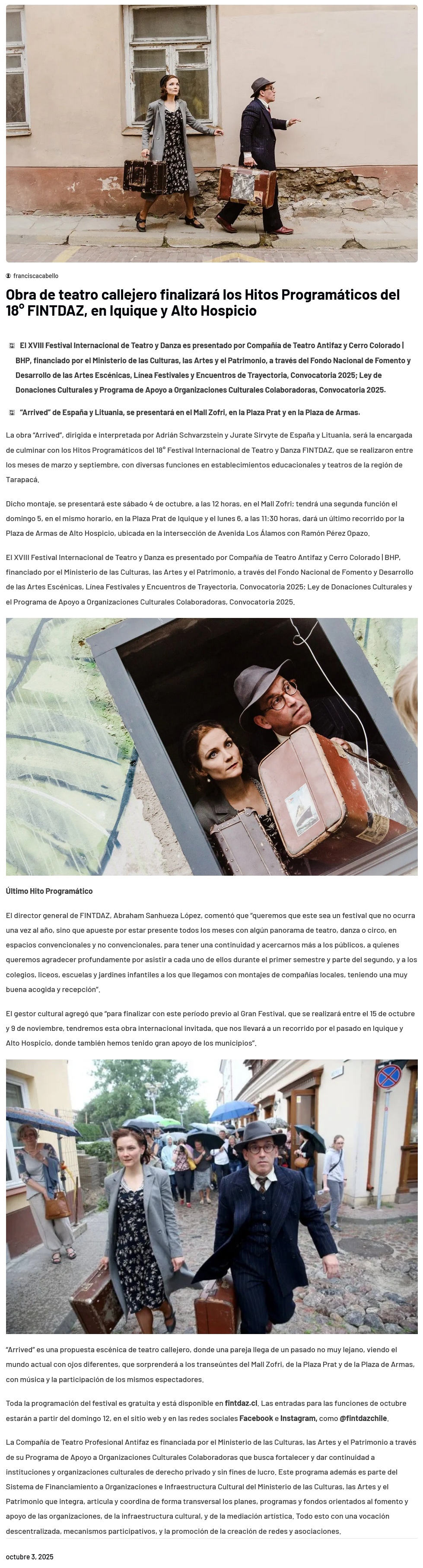 Obra de teatro callejero «Arrives», de España y Lituania, finalizan Hitos Programáticos del 18° FINTDAZ, en Iquique y Alto Hospicio - (edicioncero)