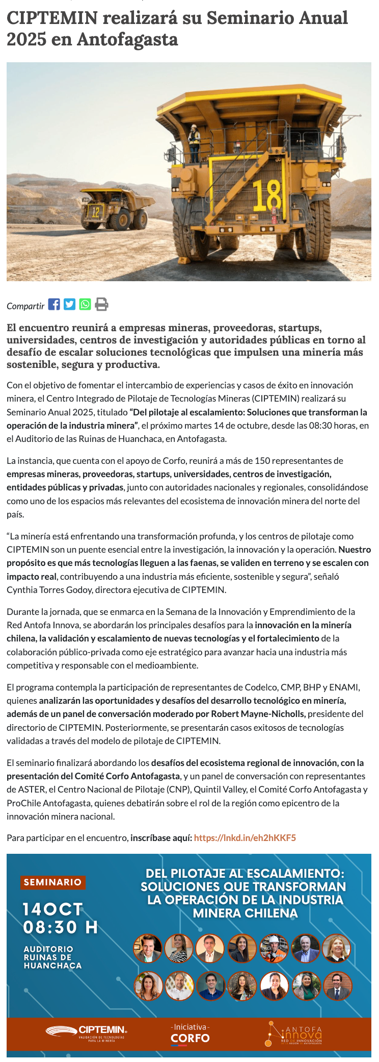 CIPTEMIN realizará su Seminario Anual 2025 en Antofagasta: “Del pilotaje al escalamiento: Soluciones que transforman la operación de la industria minera” - (mineriayfuturo.cl)