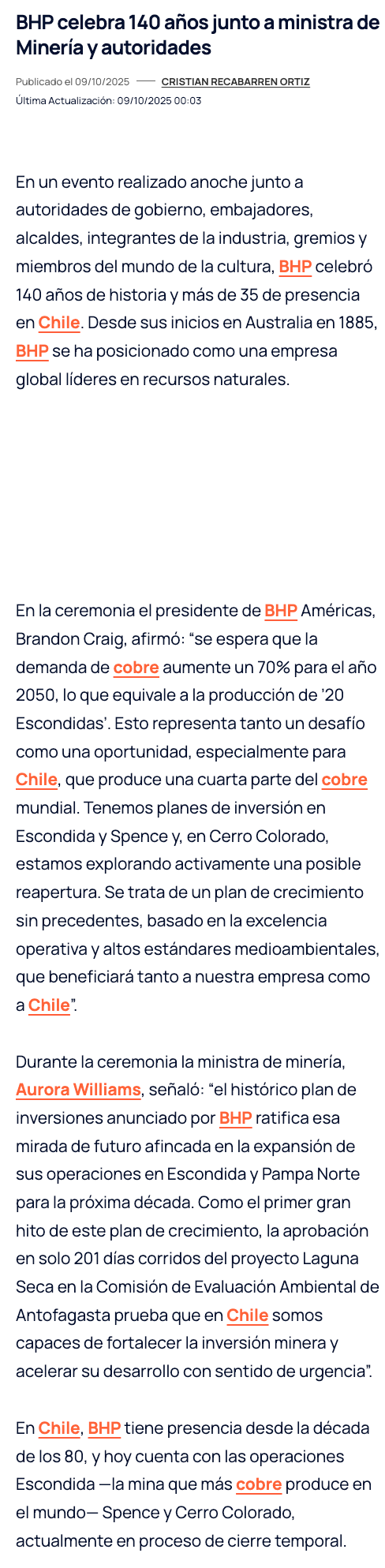 BHP celebra 140 años y anuncia fuerte plan de inversión - (norteonline.cl)
