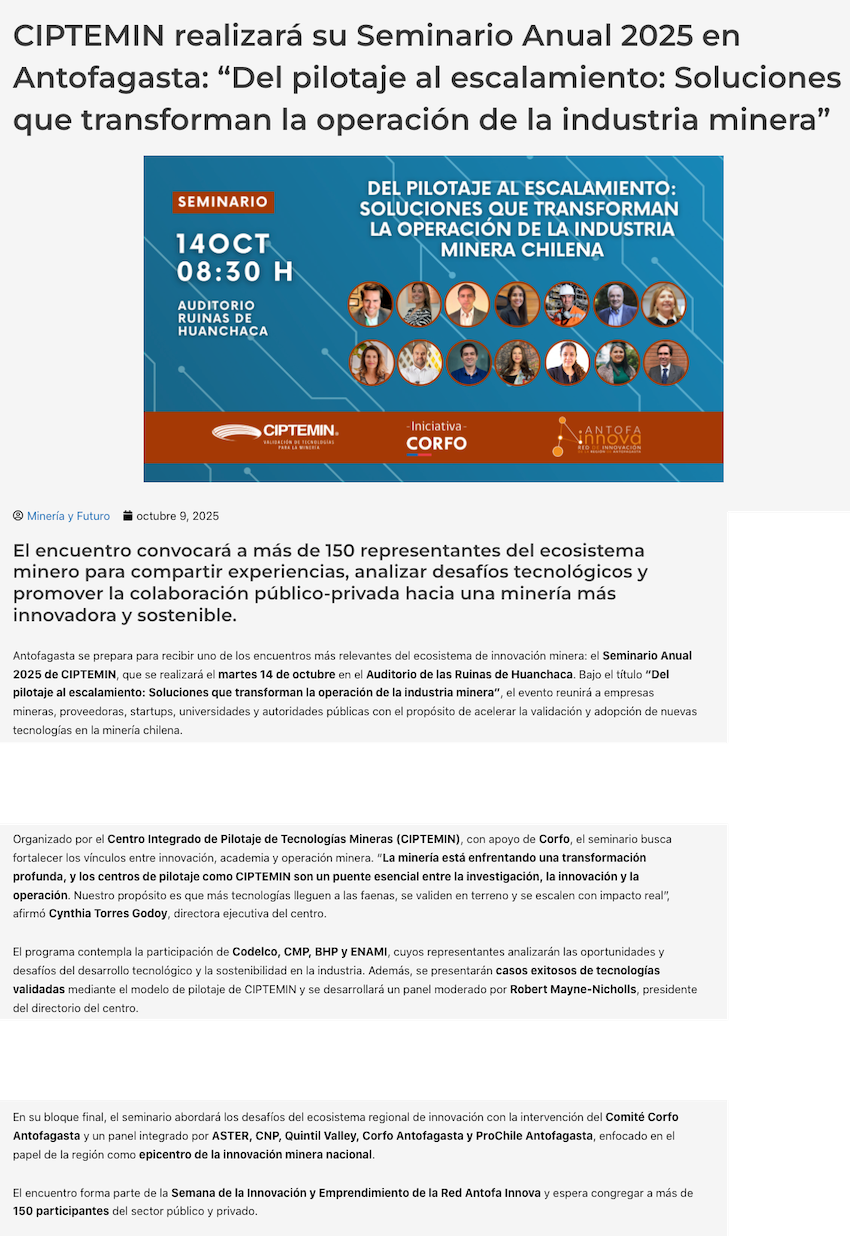CIPTEMIN realizará su Seminario Anual 2025 en Antofagasta: “Del pilotaje al escalamiento: Soluciones que transforman la operación de la industria minera” - (redimin)