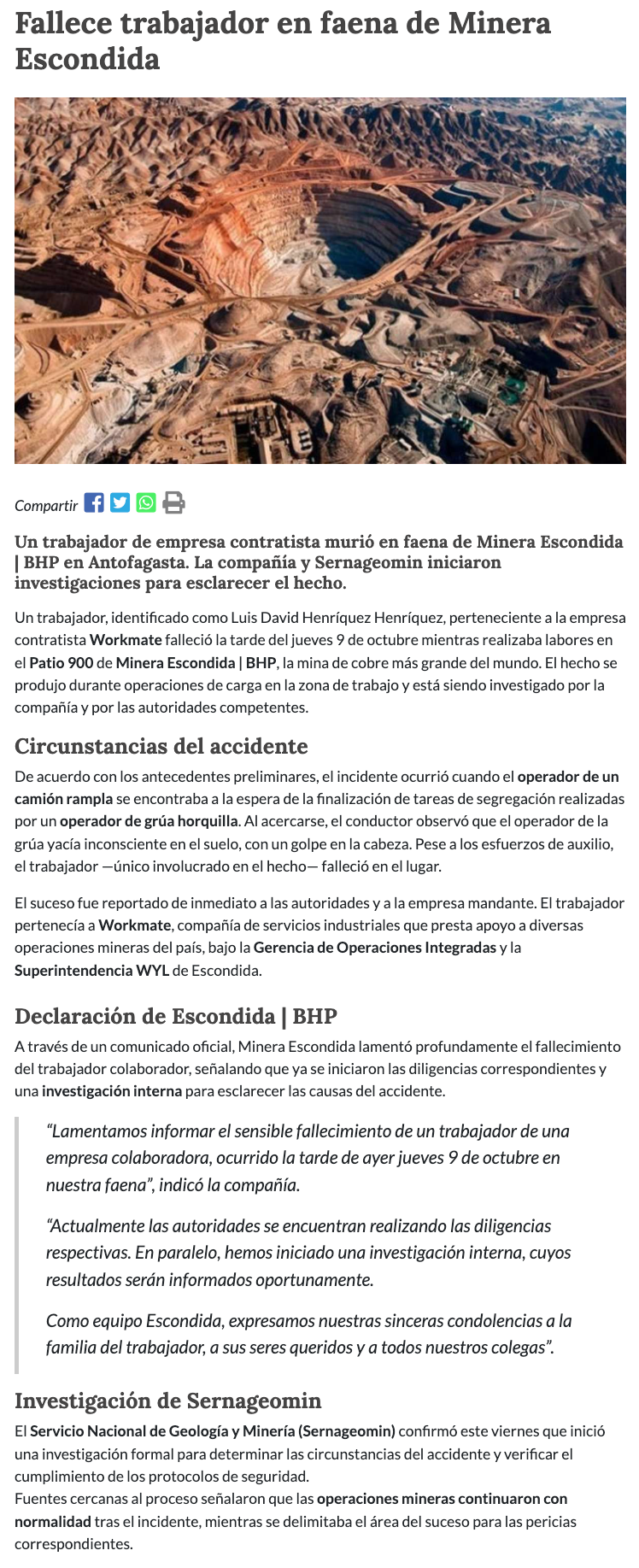 Trabajador de empresa colaboradora fallece en Minera Escondida BHP - (antofagasta.tv)