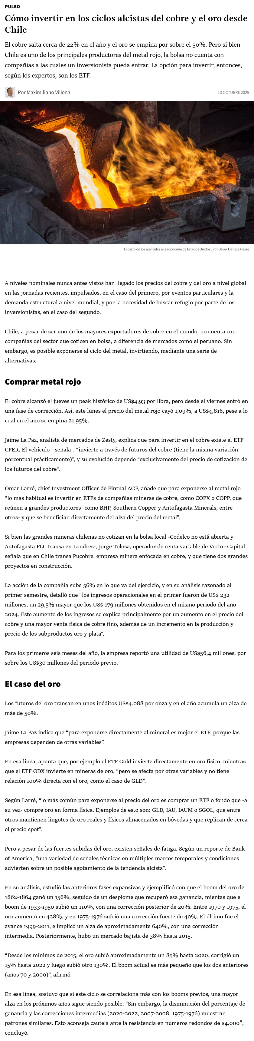 Cómo invertir en los ciclos alcistas del cobre y el oro desde Chile - (Pulso)