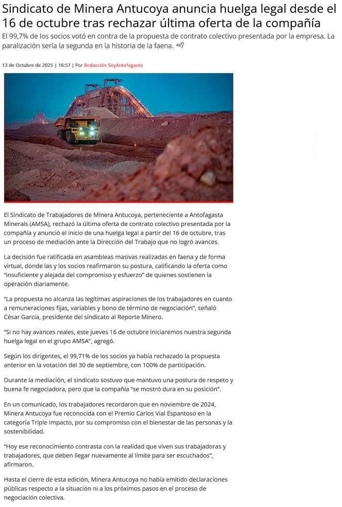 Sindicato de Antucoya vuelve a rechazar la oferta y la huelga comenzaría el jueves - (El Mercurio de Antofagasta)