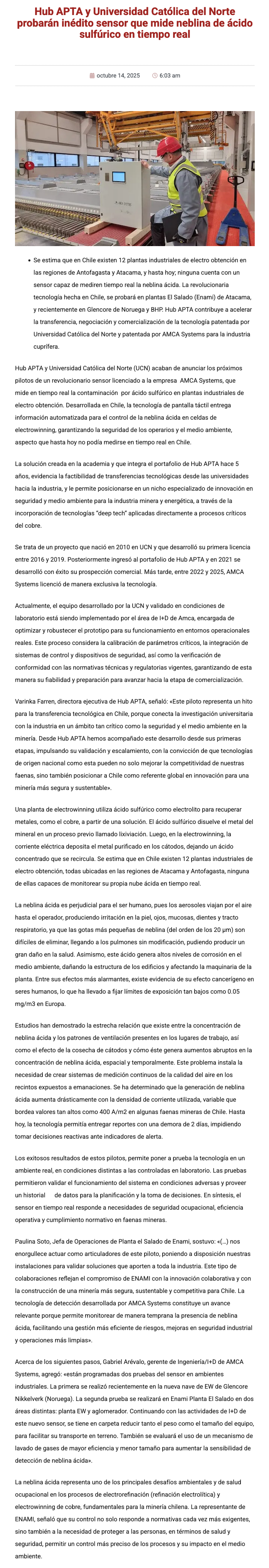 Hub APTA y UCN probarán sensor chileno pionero que mide neblina ácida en tiempo real - (reporteminero)