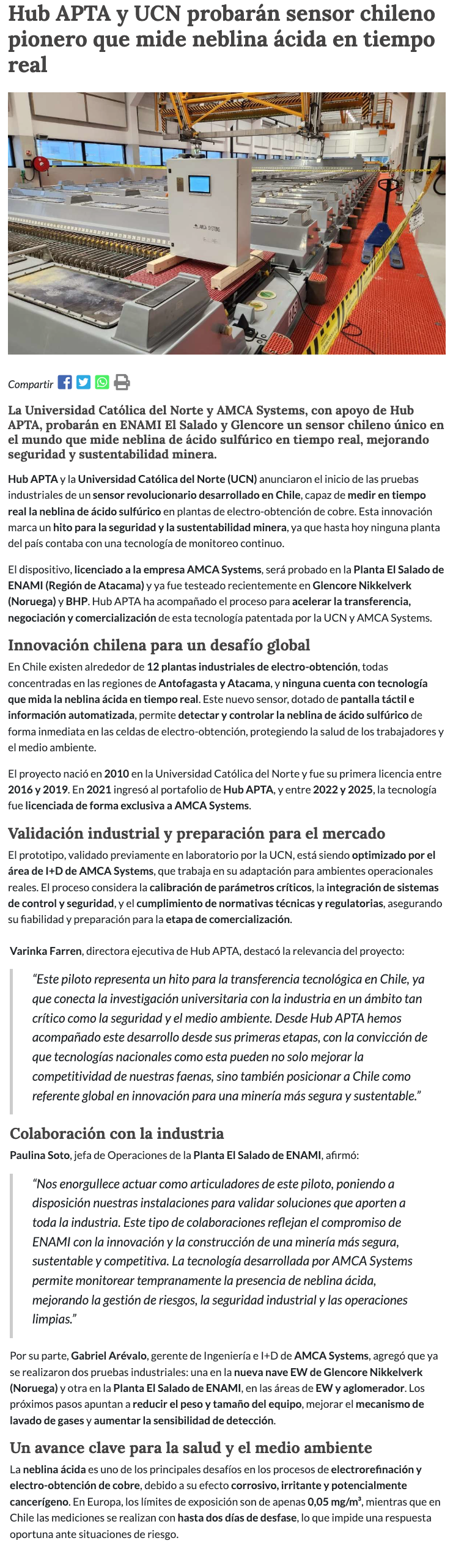 Hub APTA y Universidad Católica del Norte probarán inédito sensor que mide neblina de ácido sulfúrico en tiempo real - (tierramarillano.cl)