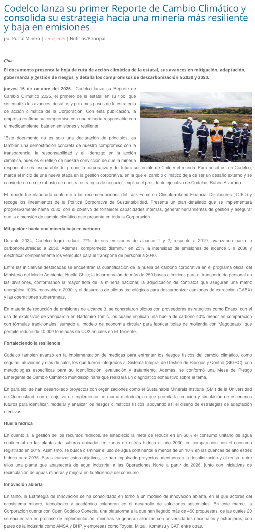 Codelco lanza su primer Reporte de Cambio Climático y consolida su estrategia hacia una minería más resiliente y baja en emisiones - (redimin)