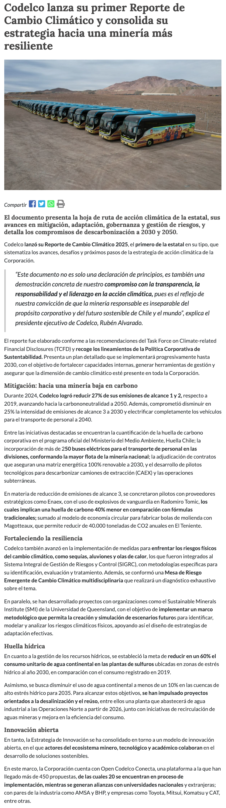 Codelco lanza su primer Reporte de Cambio Climático y consolida su estrategia hacia una minería más resiliente y baja en emisiones - (redimin)