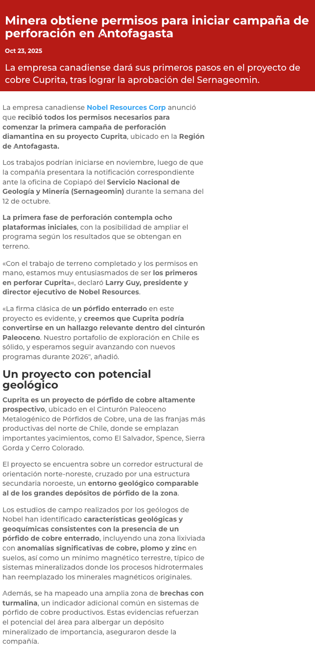 Nobel Resources recibe autorización para perforaciones en Cuprita, Antofagasta - (redimin)