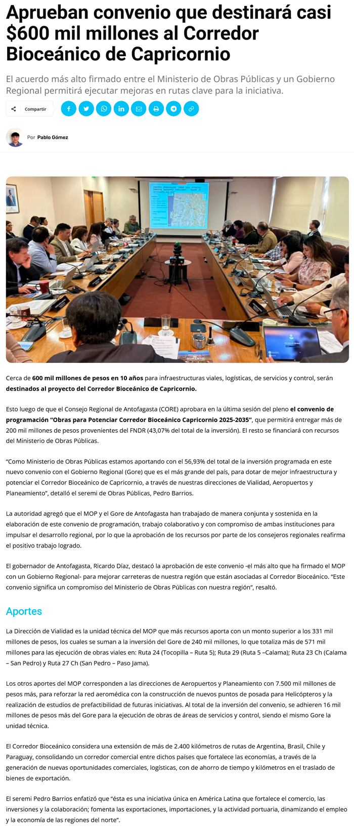 Core aprueba millonario convenio con MOP para potenciar el Corredor Bioceánico - (El Mercurio de Antofagasta)