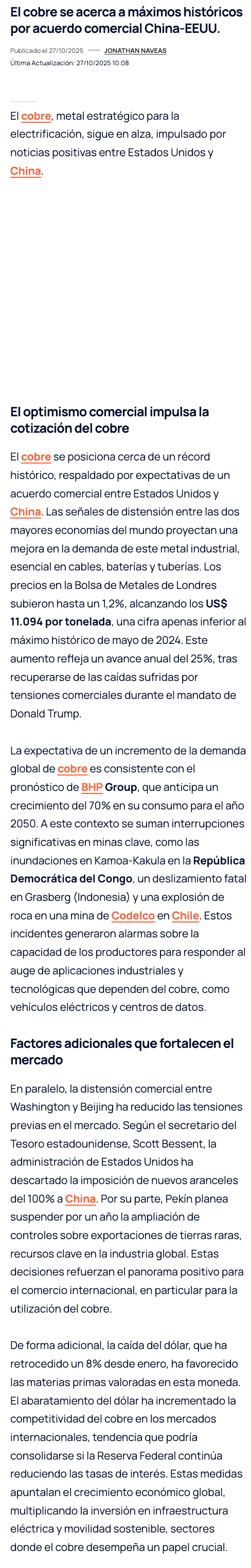 El cobre se acerca a un récord mientras optimismo entre Estados Unidos y China impulsa la demanda en medio de problemas de suministro - (DF Online)