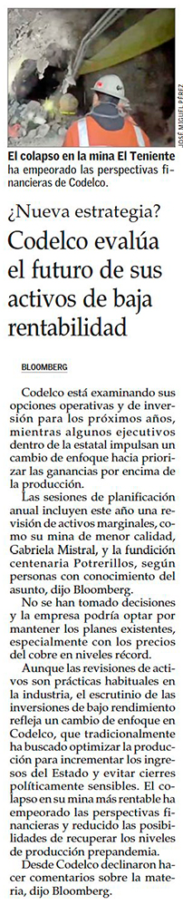 Codelco baraja no extender vida útil de su mina Gabriela Mistral y que opere hasta 2028 - (Diario Financiero)