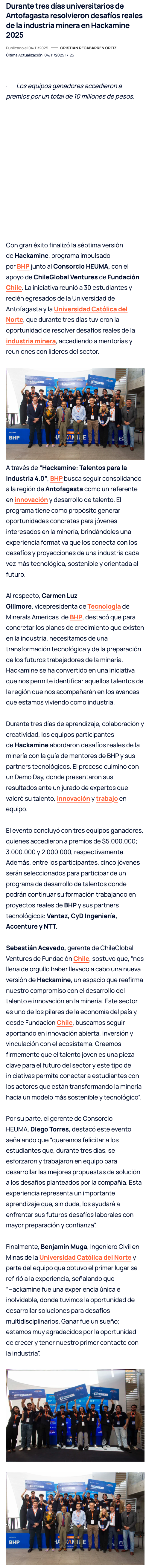 Durante tres días universitarios de Antofagasta resolvieron desafíos reales de la industria minera en Hackamine 2025 - (mvcomunicaciones.cl)