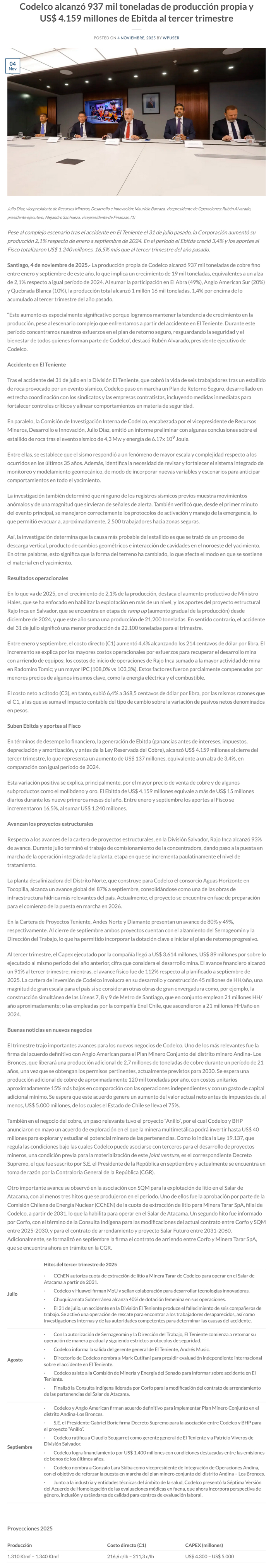 Codelco alcanzó 937 mil toneladas de producción propia y US$ 4.159 millones de Ebitda al tercer trimestre - (portalminero)