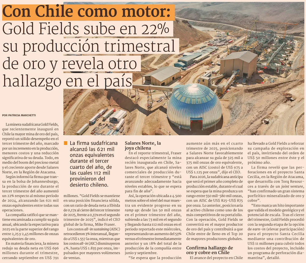 Con Chile como motor: Gold Fields aumenta en 22% su producción trimestral de oro y revela otro hallazgo minero en el país - (DF Online)