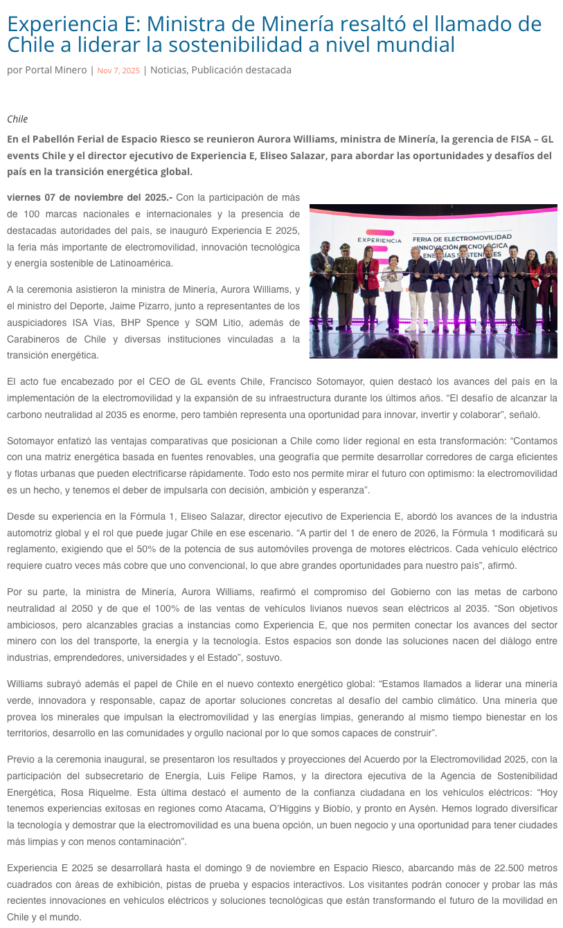 Comienza Experiencia E 2025: ministra Aurora Williams destaca el liderazgo de Chile en sostenibilidad y minería verde - (mineriayfuturo.cl)